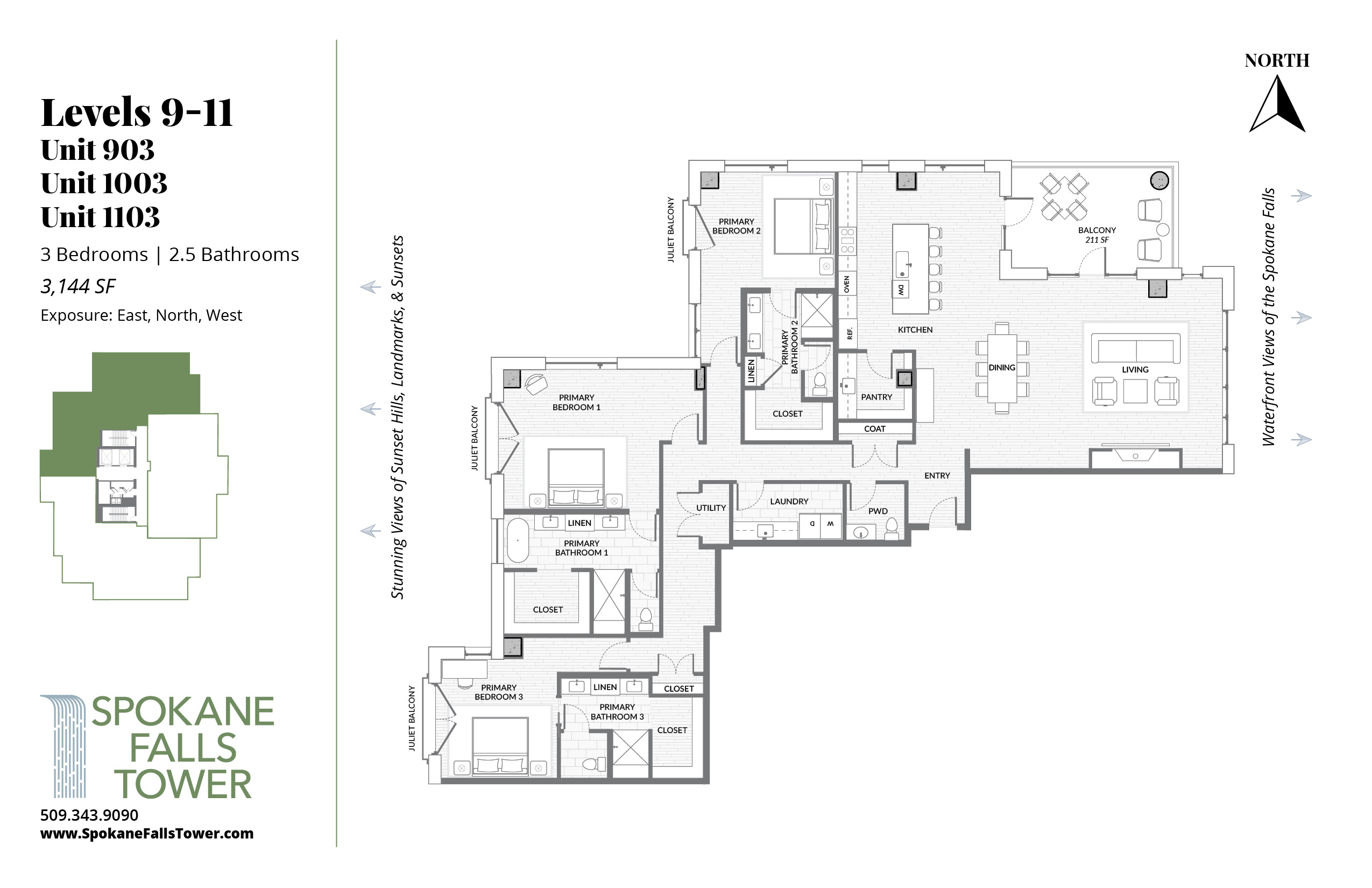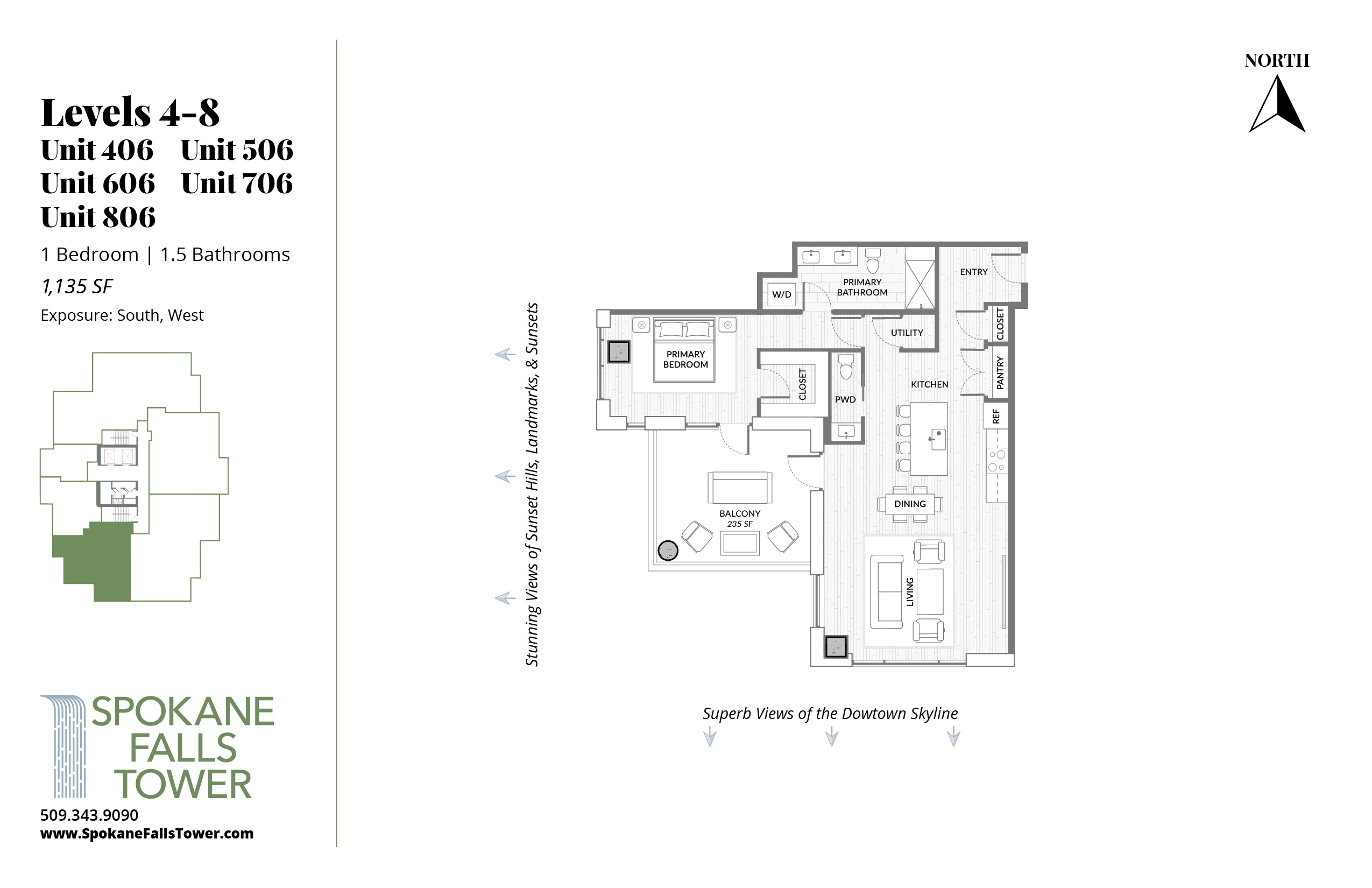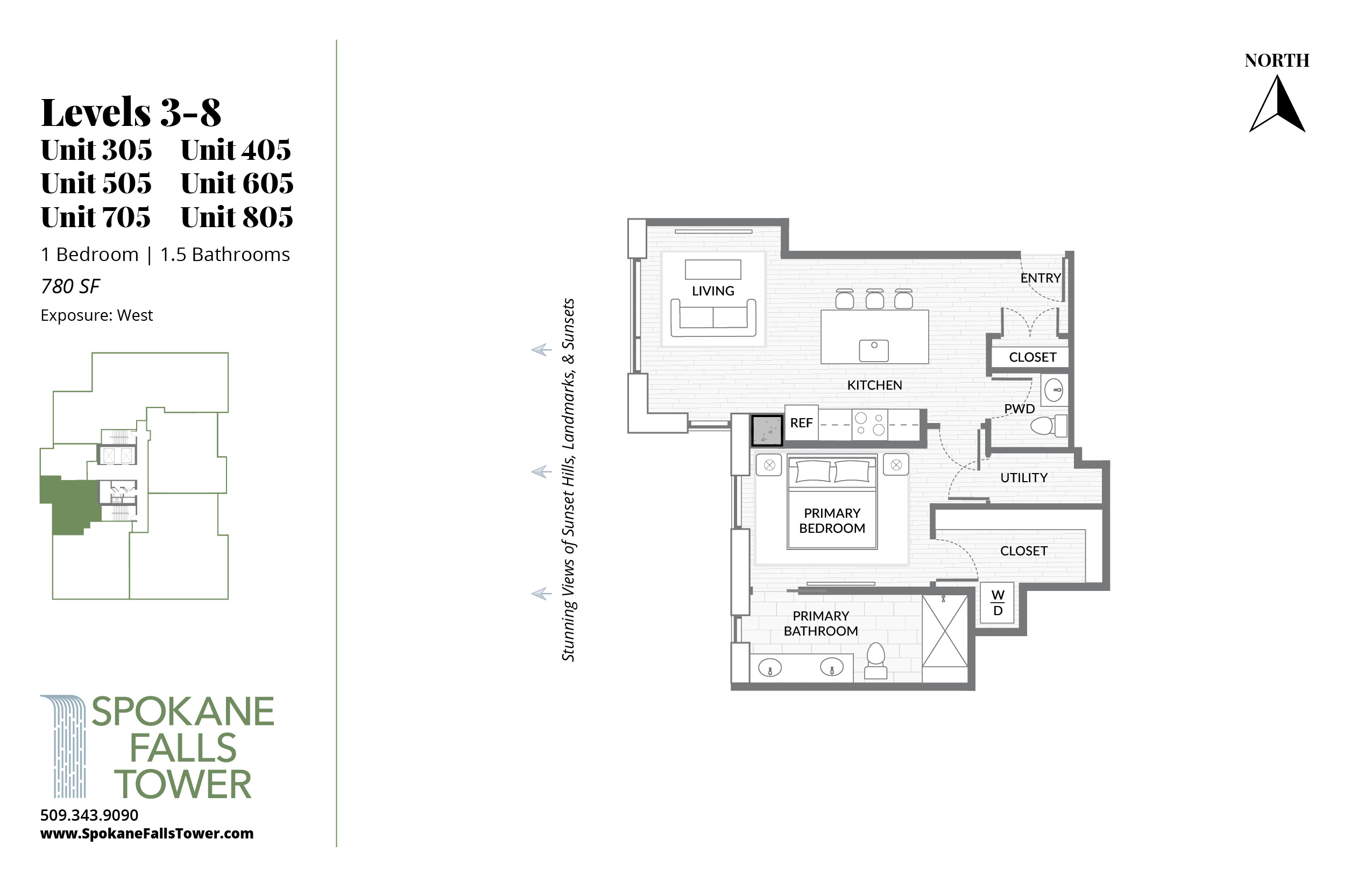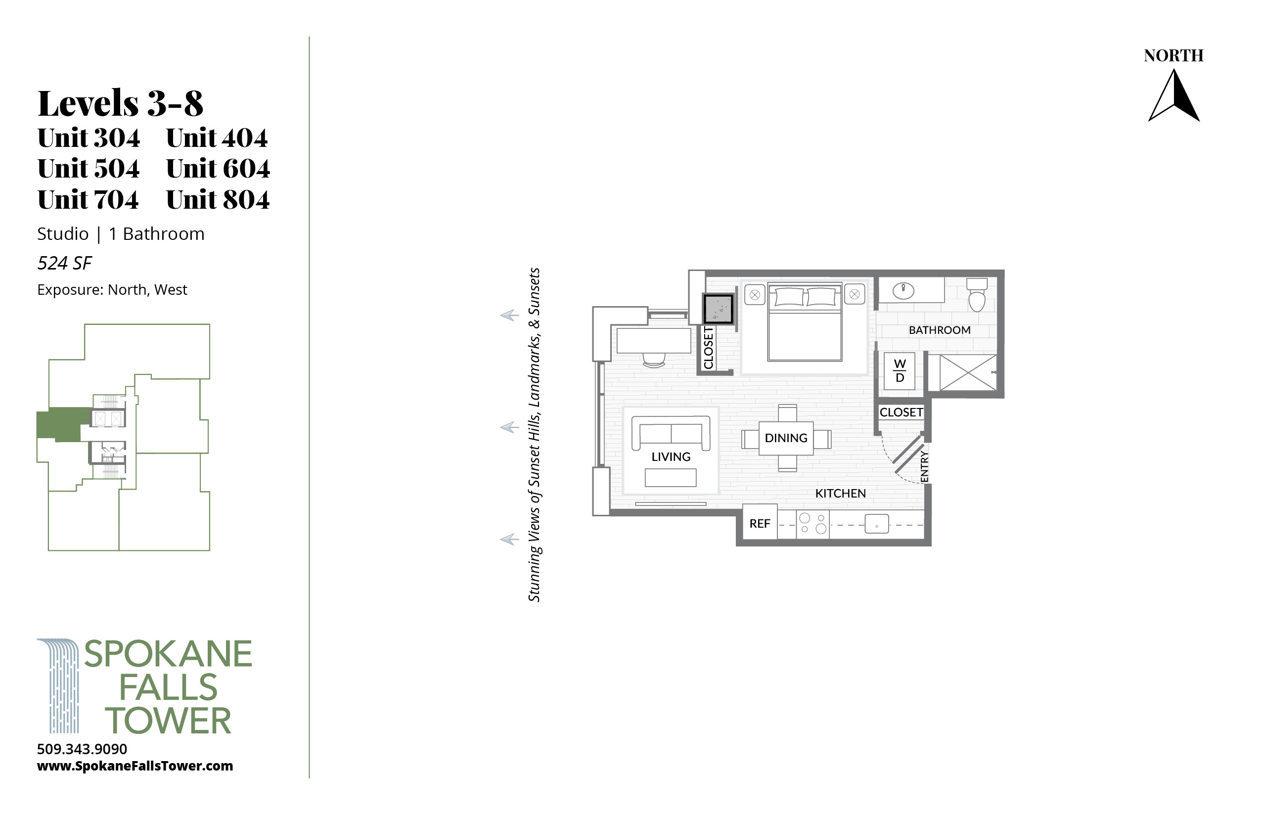 We are thrilled to unveil the floorplans for the Spokane Falls Tower! This impressive 12-story tower will feature 48 meticulously designed homes, offering a diverse selection of living spaces. The building will include 6 studios, 12 one-bedroom units, 23 two-bedroom units, and 6 three-bedroom units, catering to a variety of lifestyles. With homes ranging from 524 square feet to an expansive 3,144 square feet, there’s a perfect space for everyone to call home.