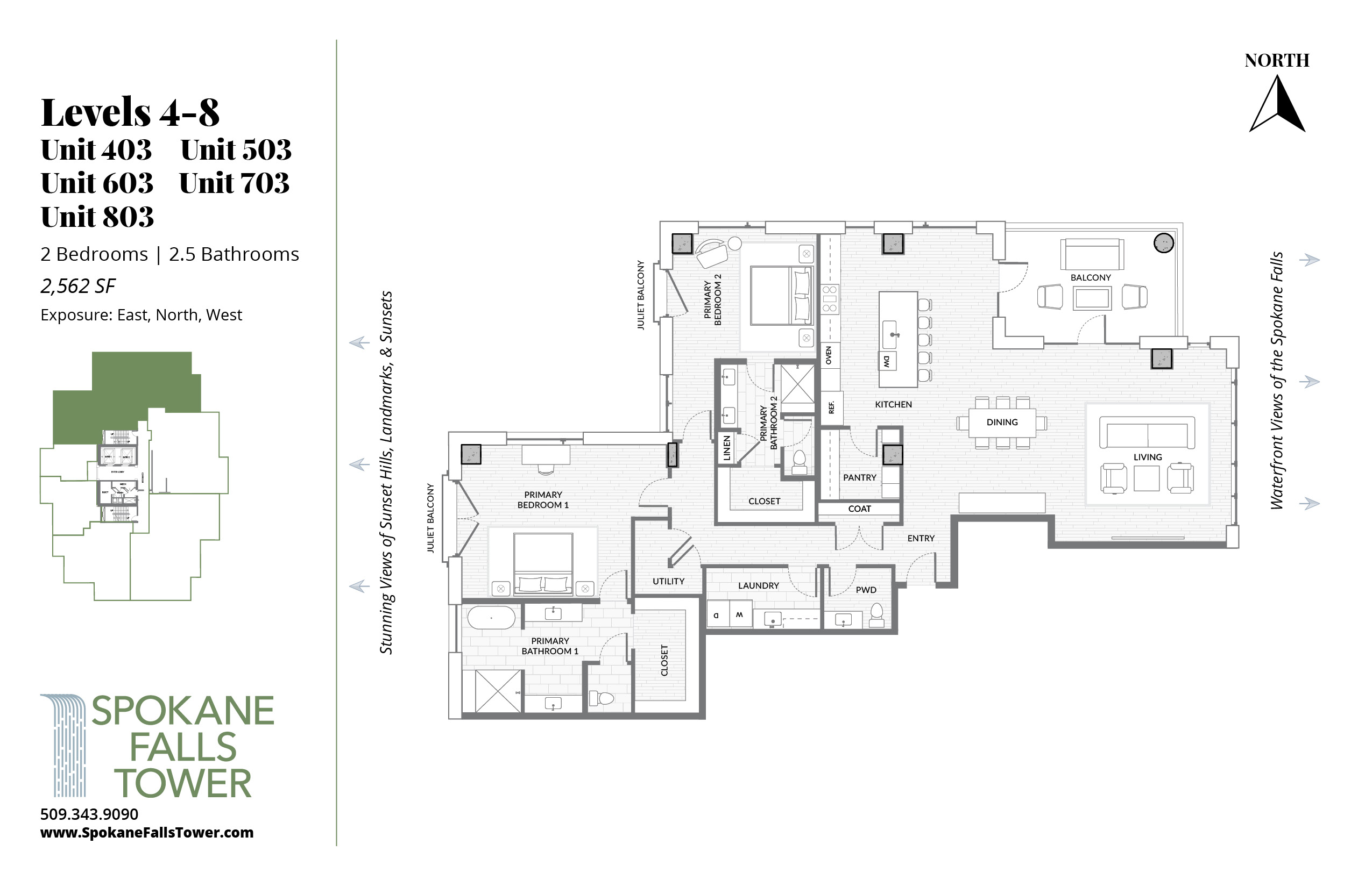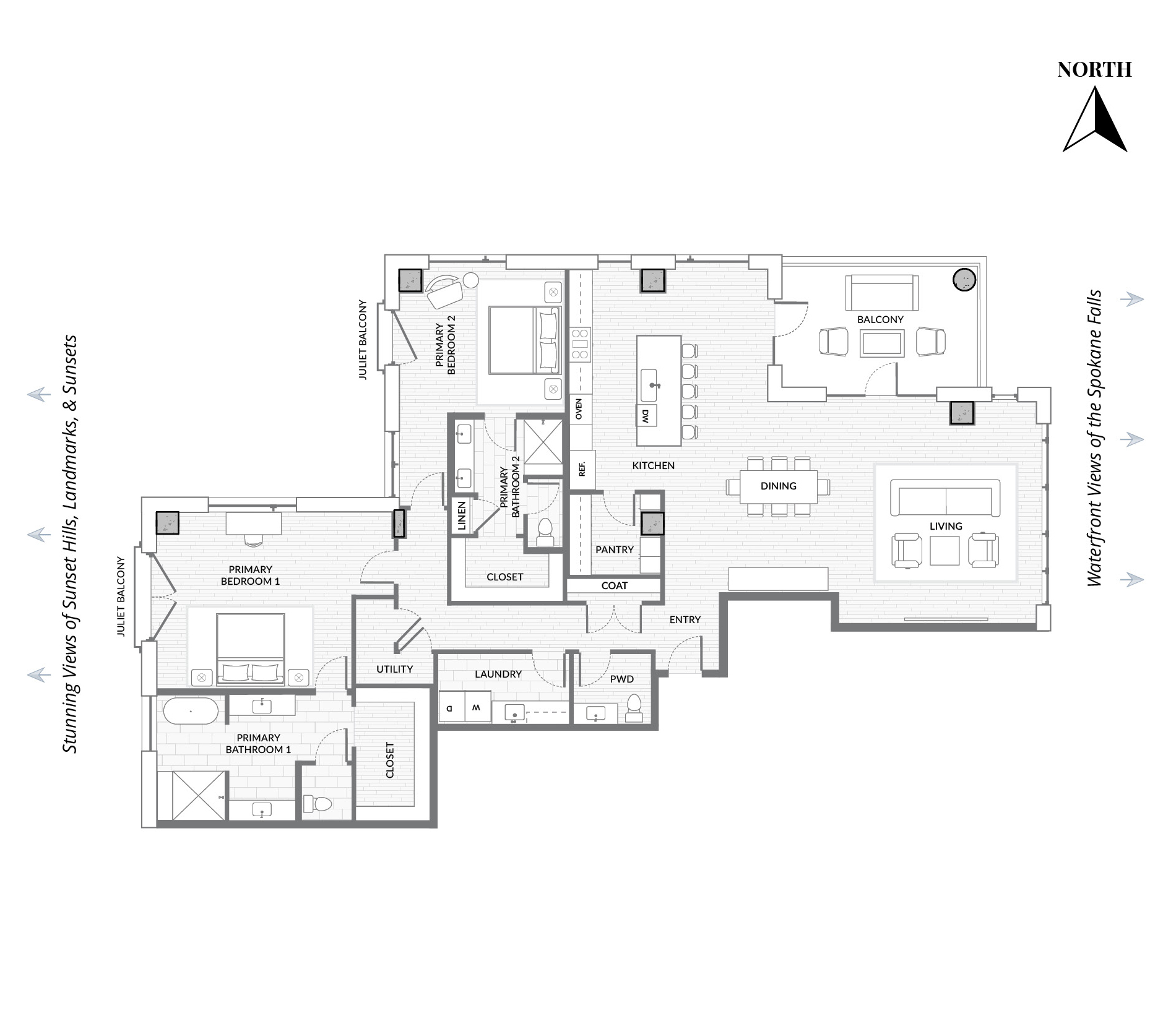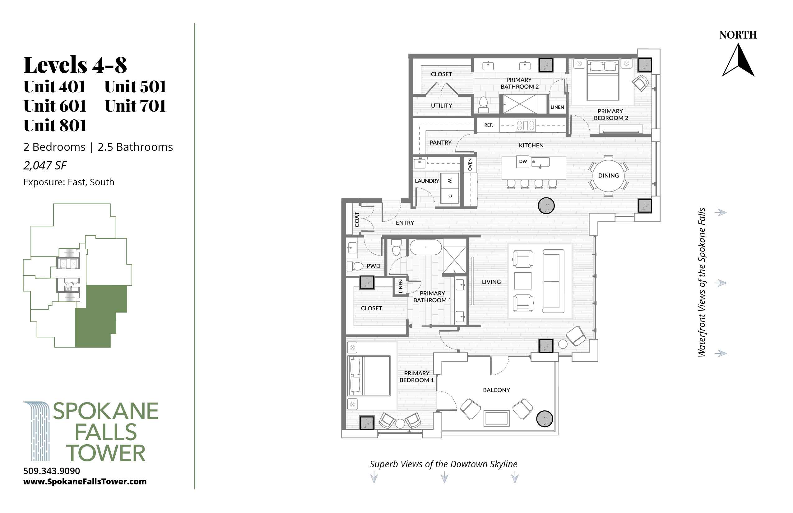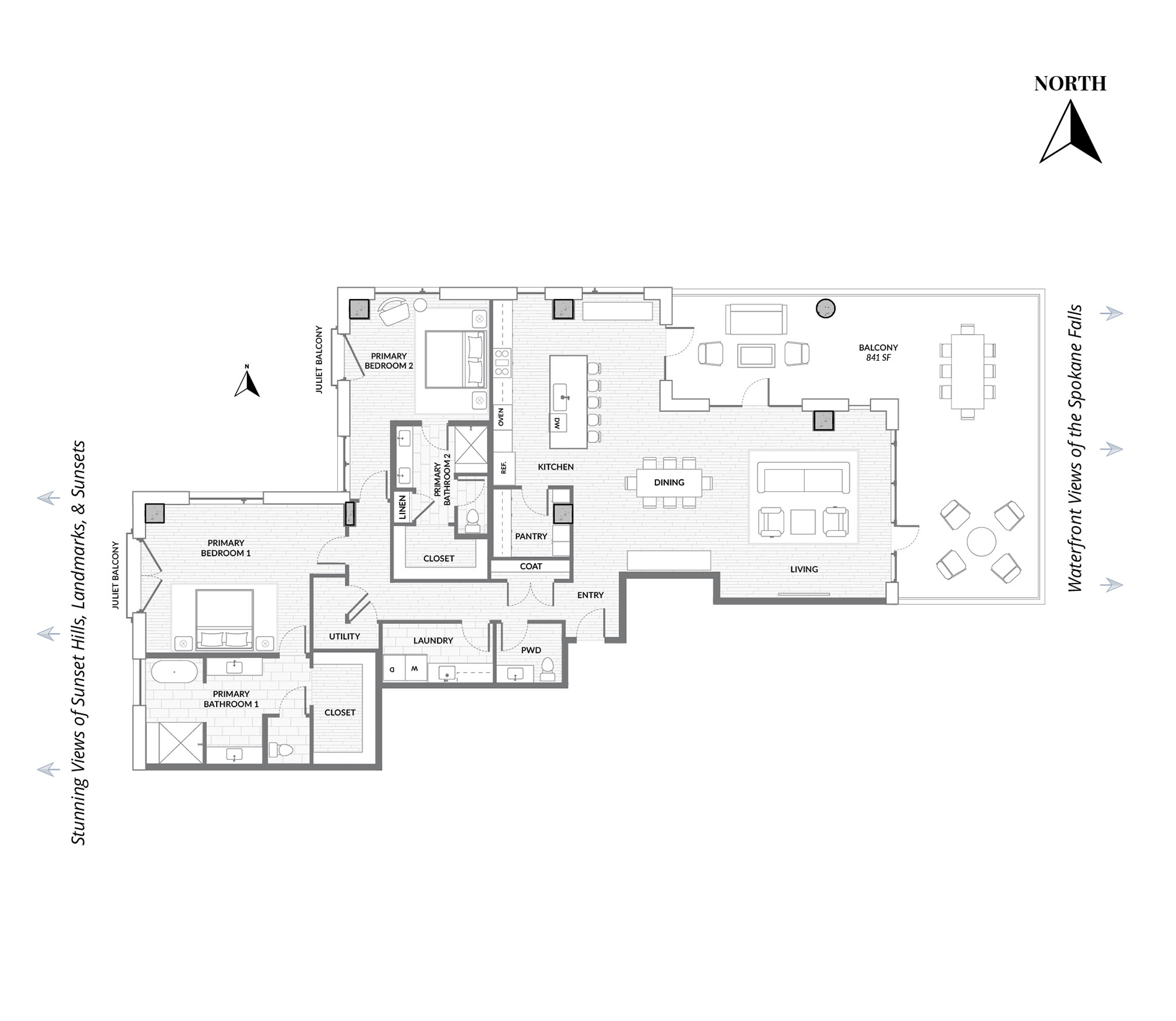 We are thrilled to unveil the floorplans for the Spokane Falls Tower! This impressive 12-story tower will feature 48 meticulously designed homes, offering a diverse selection of living spaces. The building will include 6 studios, 12 one-bedroom units, 23 two-bedroom units, and 6 three-bedroom units, catering to a variety of lifestyles. With homes ranging from 524 square feet to an expansive 3,144 square feet, there’s a perfect space for everyone to call home.