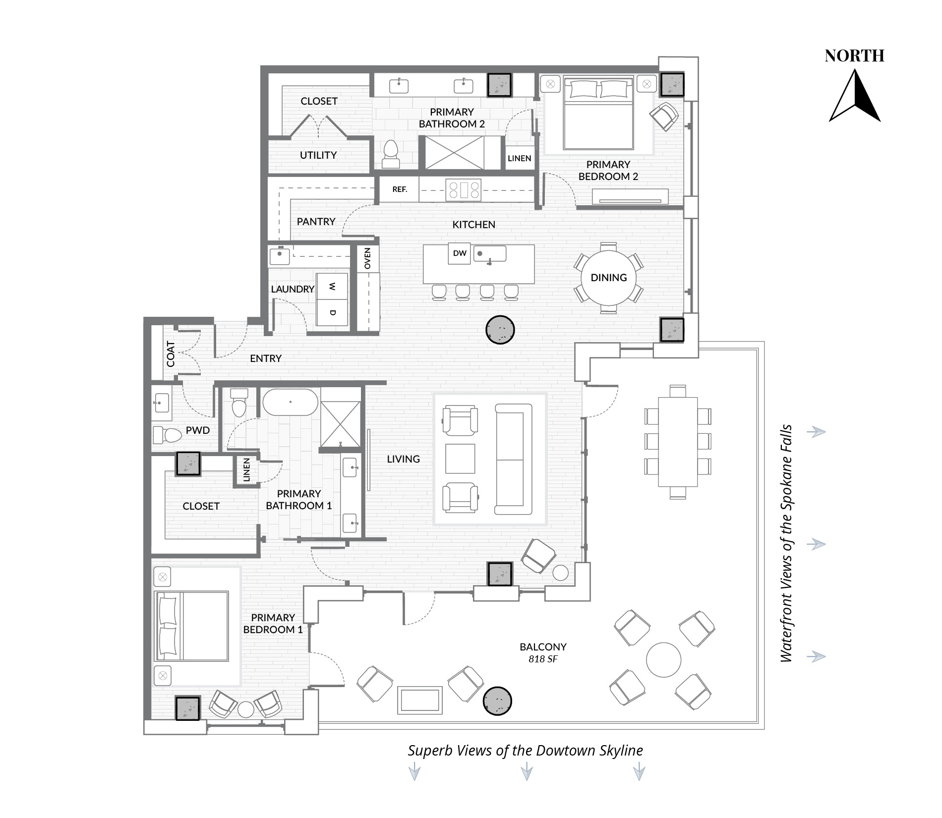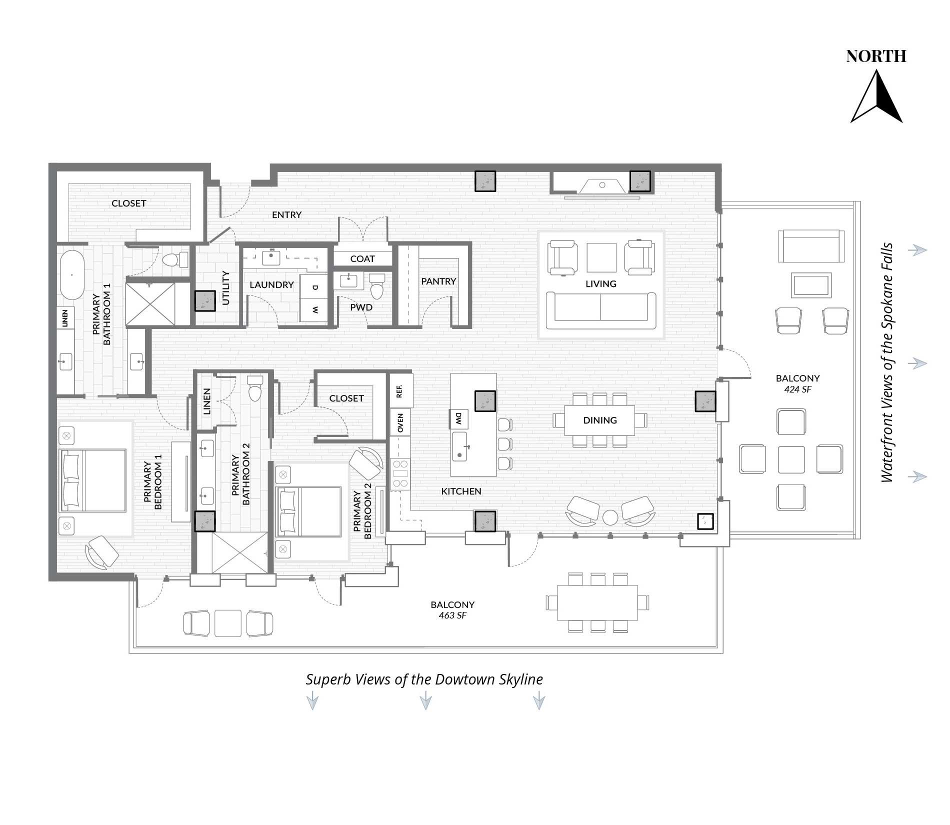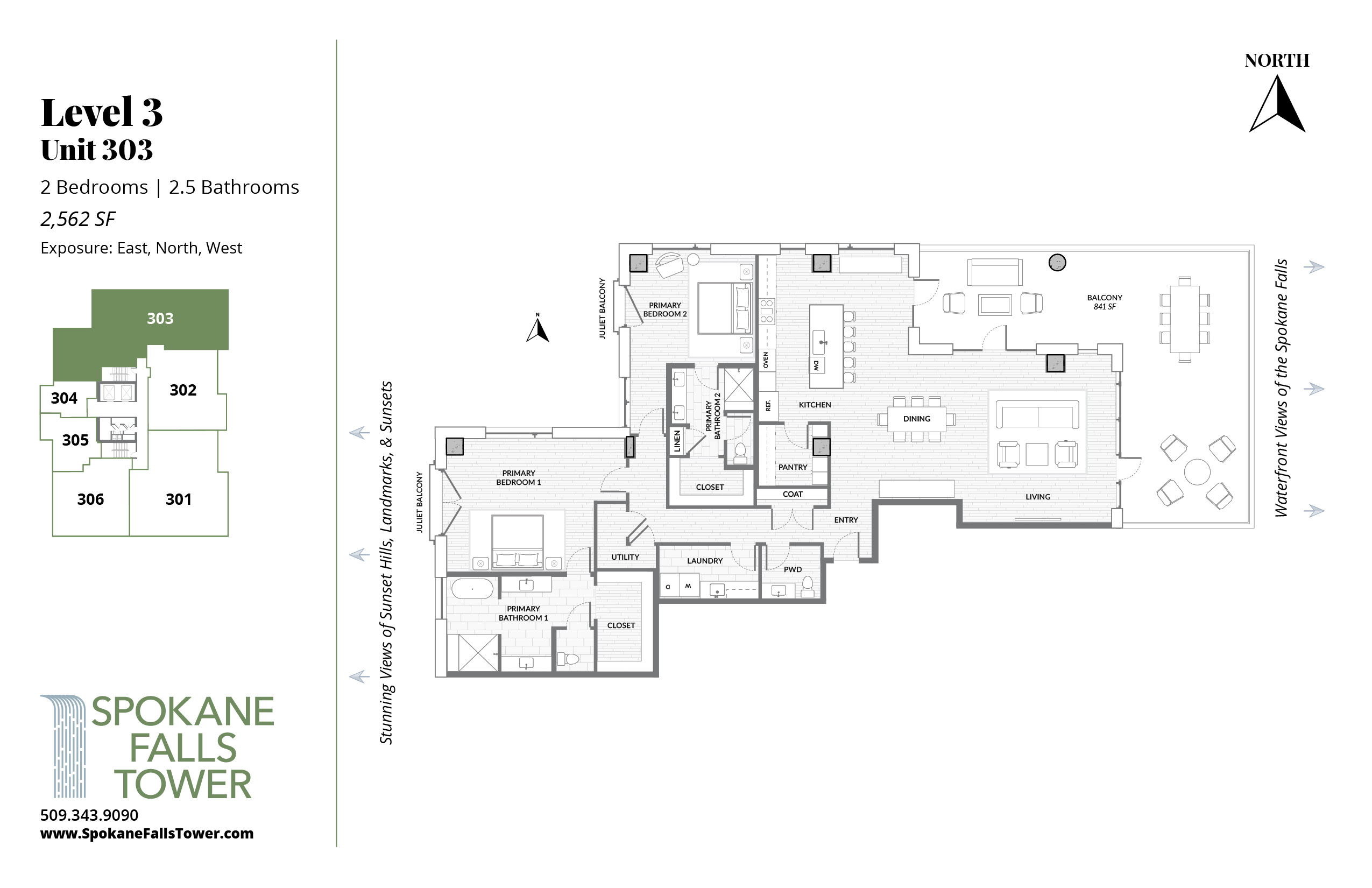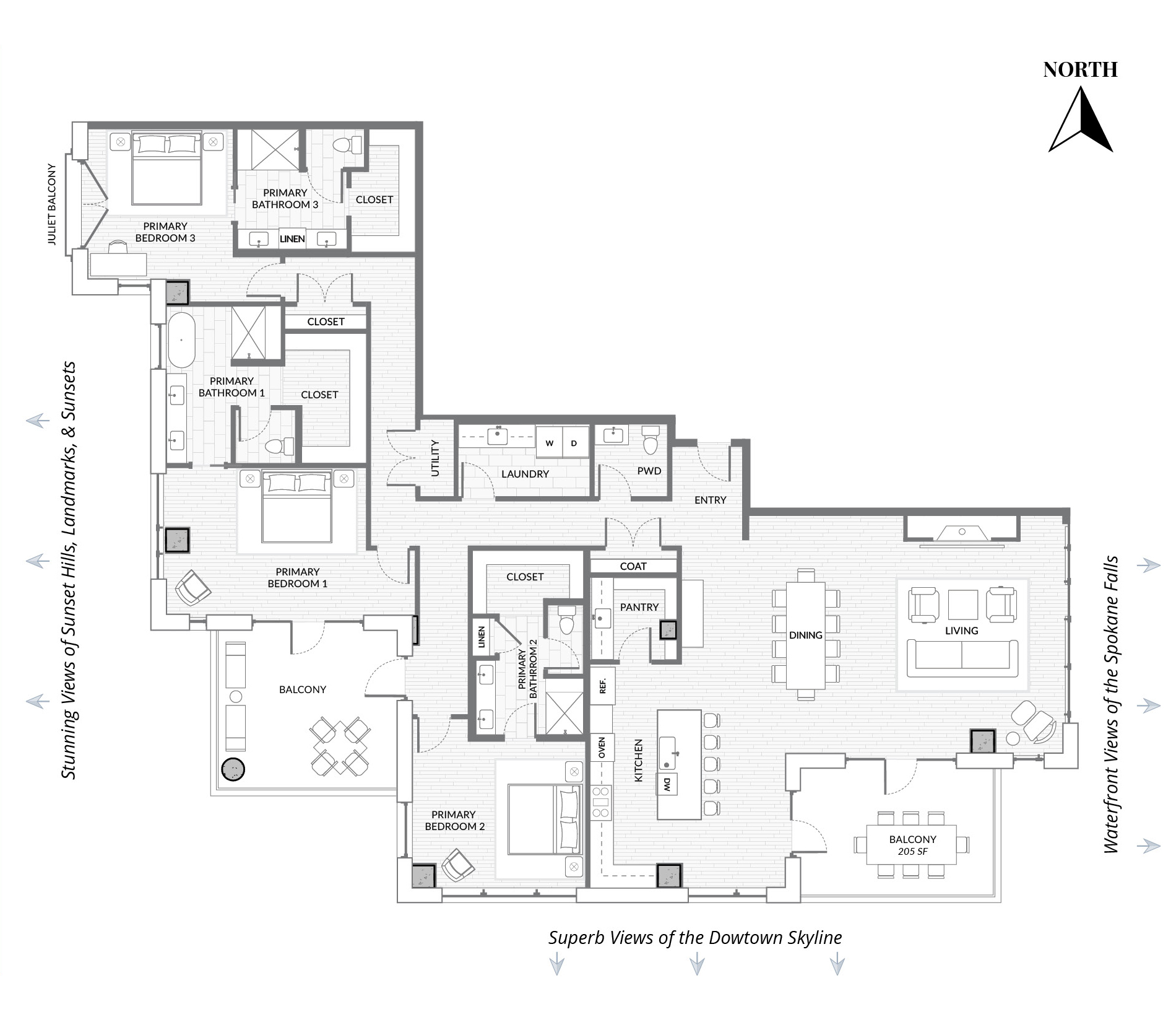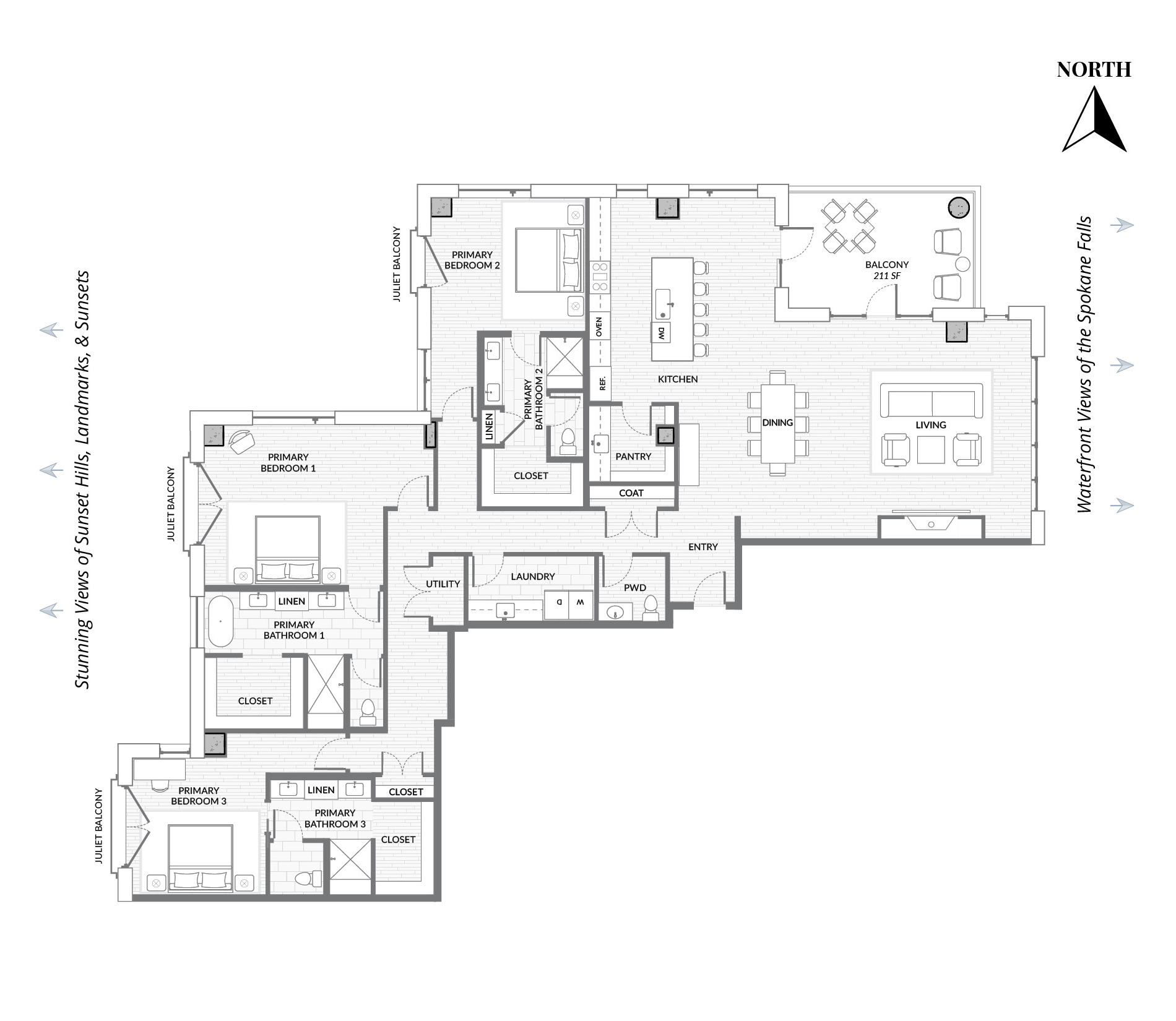 We are thrilled to unveil the floorplans for the Spokane Falls Tower! This impressive 12-story tower will feature 48 meticulously designed homes, offering a diverse selection of living spaces. The building will include 6 studios, 12 one-bedroom units, 23 two-bedroom units, and 6 three-bedroom units, catering to a variety of lifestyles. With homes ranging from 524 square feet to an expansive 3,144 square feet, there’s a perfect space for everyone to call home.