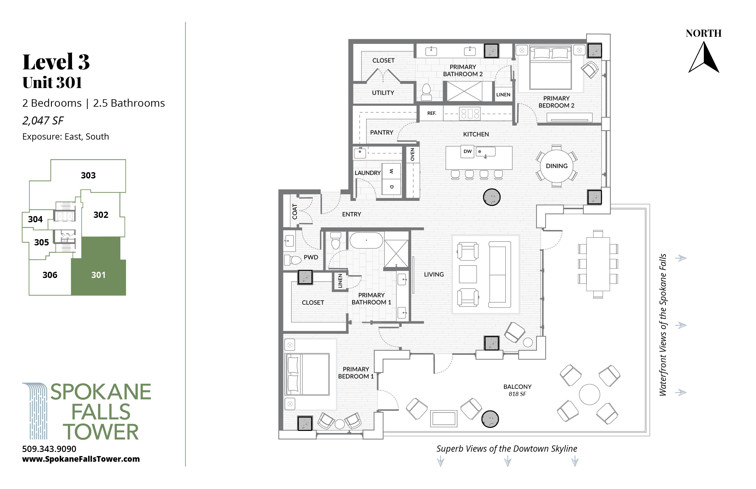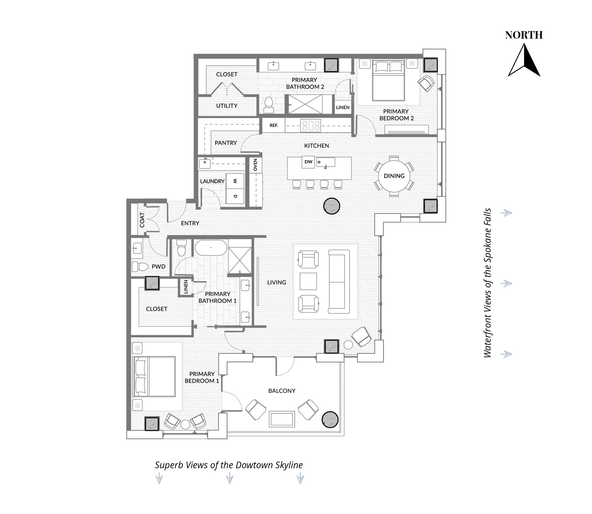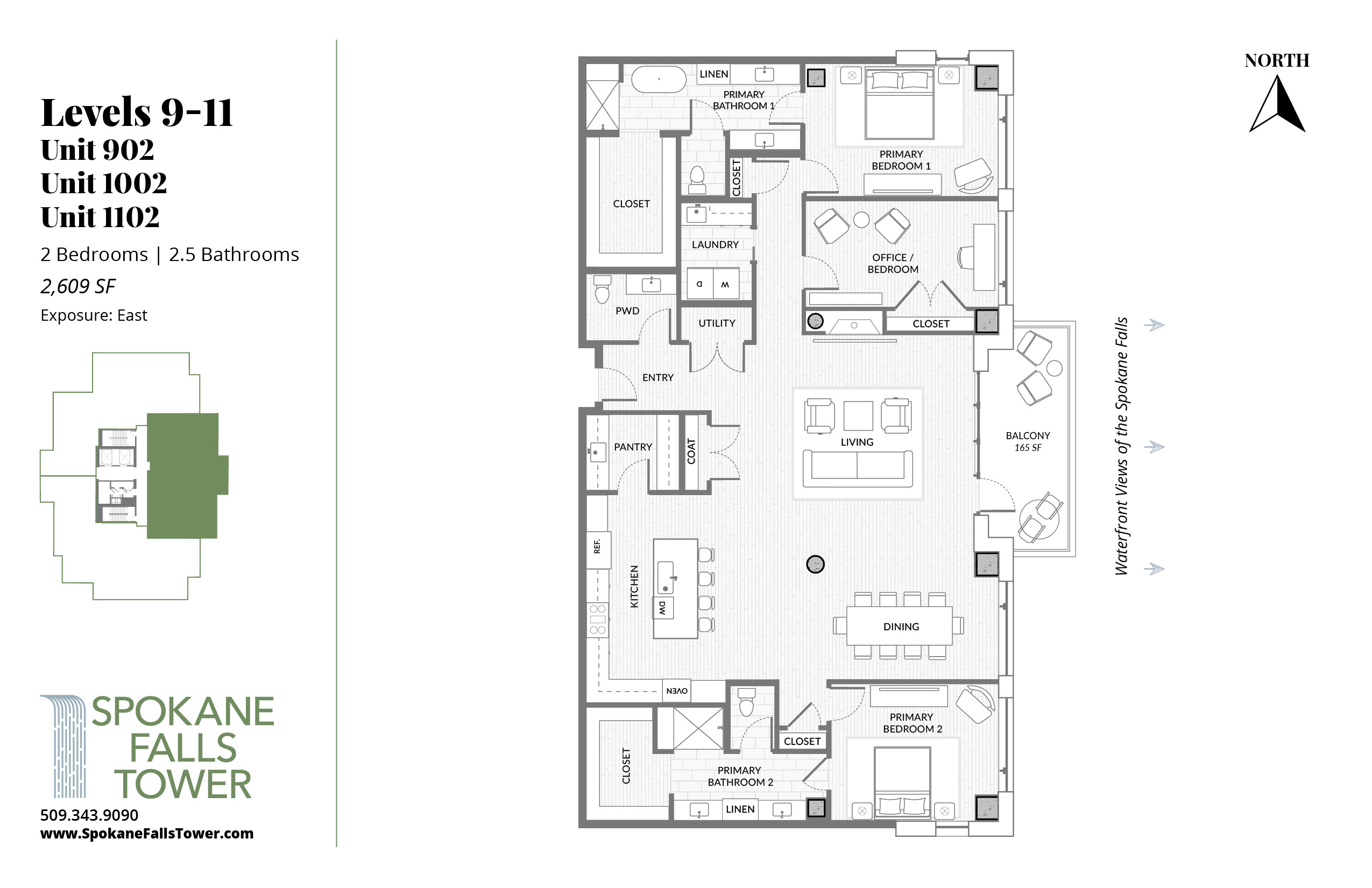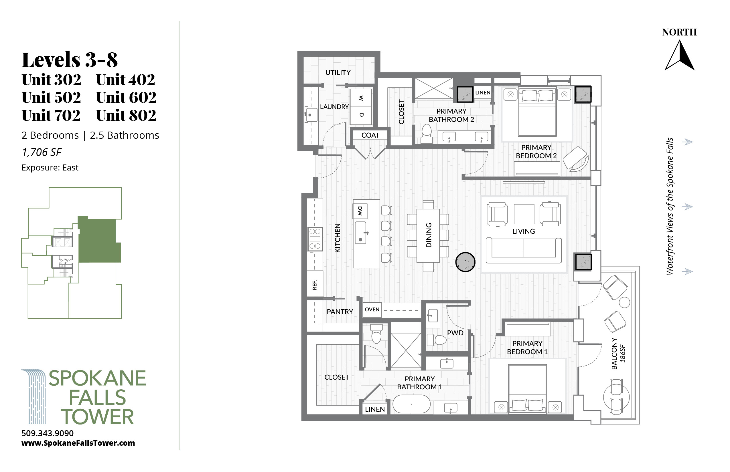 We are thrilled to unveil the floorplans for the Spokane Falls Tower! This impressive 12-story tower will feature 48 meticulously designed homes, offering a diverse selection of living spaces. The building will include 6 studios, 12 one-bedroom units, 23 two-bedroom units, and 6 three-bedroom units, catering to a variety of lifestyles. With homes ranging from 524 square feet to an expansive 3,144 square feet, there’s a perfect space for everyone to call home.
